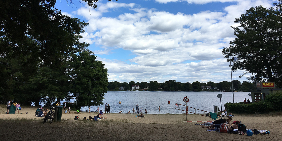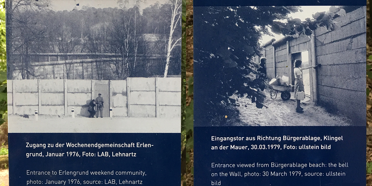 在笔者参观这个岗楼时,正好有一对母子也在瞭望塔里参观。孩子大概有7、8岁的样子。他对那个望远镜很感兴趣。转了又转,看了又看。然后他开始问他的妈妈一些最基础的问题:为什么要建这么一堵墙,为什么当时东德的人不可以随便到西德来,而西德人可以过去?为什么会有人试图偷渡?这对母与子的对话在我听来很像一堂小学还是中学的历史课。然后我想到,这段似乎每个德国人都应该知道的历史,对现在的年轻人来说并不是一生下来就知道的,是真的要学的知识。而这些被保存下来的历史遗迹当然是最好的教科书。相信这些孩子们在亲手触摸了这些遗迹之后,在给自己提出了这些问题,然后自己找到或得出了答案或结论之后,会更加主动地以史为鉴,不要让这样的历史重演。 此处瞭望塔在夏季可以免费参观。此外,这段柏林墙自行车线路也是柏林至哥本哈根的自行线路的一部分。一路有哈弗尔河陪伴,风景多有变化,是周末郊游的好去处。 离如上所述的边境瞭望塔不远,还有一处值得介绍的地点: Bürgerablage Bürgerablage这个德语词由两部分组成:Bürger (公民),Ablage(在此可以翻译成“存放”)。历史上这里曾被用作存放木材的场所,以便木材可以由此沿哈弗尔河从水上运输。更长久的时间以来,这里就是人们的夏季休闲浴场。即使在柏林墙紧邻的时代,这里仍受到西柏林人的喜爱。